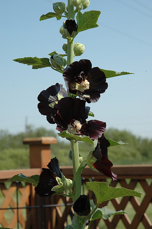 Jet Black Hollyhock is an herbaceous perennial with a rigidly upright and towering form. Its relatively coarse texture can be used to stand it apart from other garden plants with finer foliage.