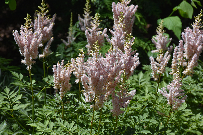 Soft, airy, creamy plumes turn to light pink as they age, rising above glossy leaves; perfect in a shady spot with dappled light; prefers moisture so water regularly for abundant flowers and nice foliage
