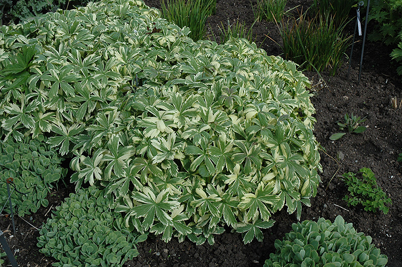 Sunningdale Variegated Masterwort will grow to be about 18 inches tall at maturity extending to 24 inches tall with the flowers, with a spread of 18 inches. When grown in masses or used as a bedding plant, individual plants should be spaced approximately 14 inches apart. It grows at a medium rate, and under ideal conditions can be expected to live for approximately 15 years. As an herbaceous perennial, this plant will usually die back to the crown each winter, and will regrow from the base each spring. Be careful not to disturb the crown in late winter when it may not be readily seen!