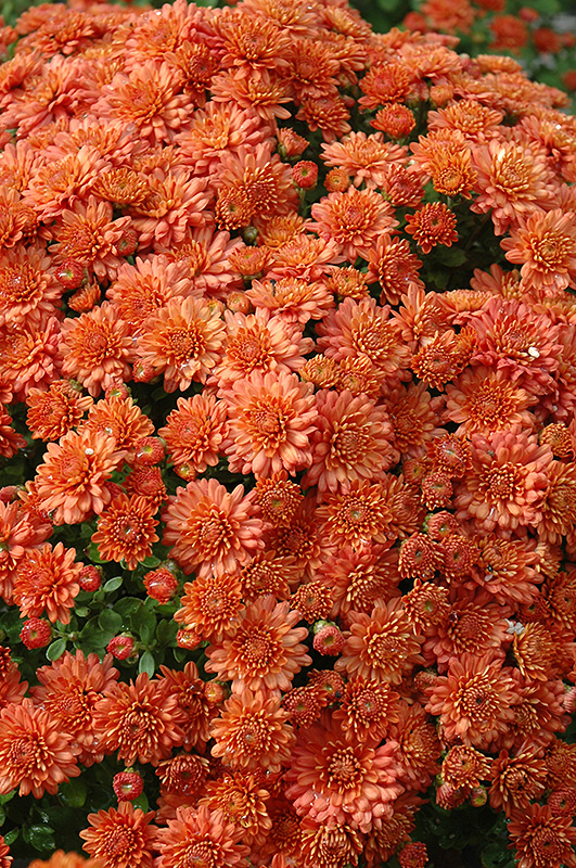 Festive Ursula Chrysanthemum is covered in stunning double orange daisy flowers at the ends of the stems from early to late fall. The flowers are excellent for cutting. Its fragrant ferny leaves remain dark green in colour throughout the season.