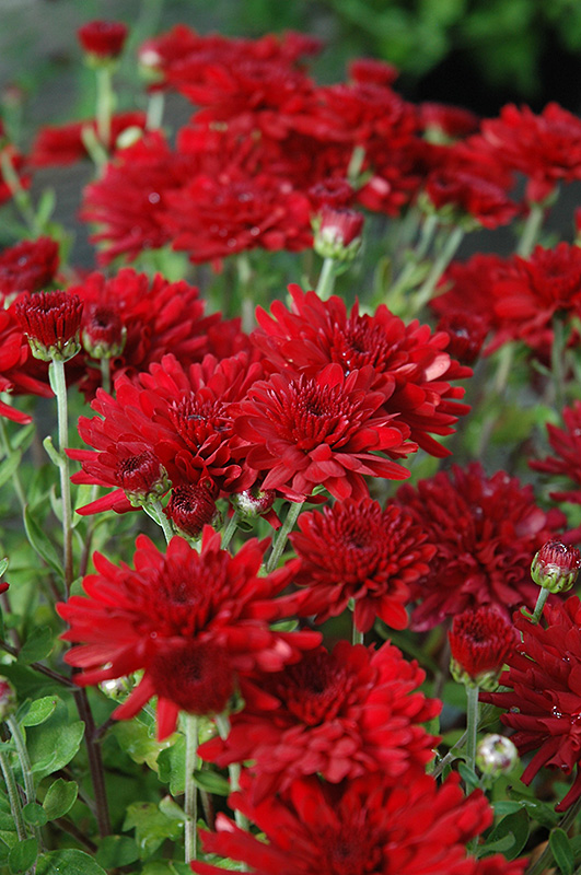 Showy, red blooms cover a mound of strong, flexible stems; blooms late in the season; adaptable to various conditions; best in full sun; a decorative mum