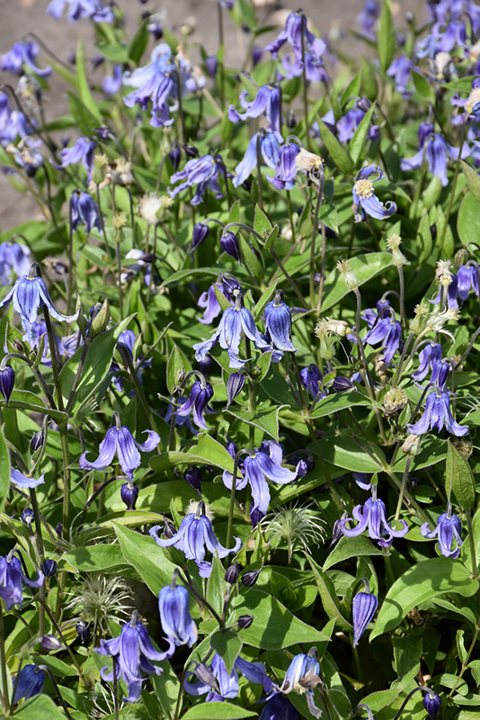 A shrubby, mounded perennial clematis; dainty, nodding, small, recurved flowers are blue with dark-purple markings, contrasted with cream colored stamens; plant in full sun and keep the roots cool for best results, prune to shape only