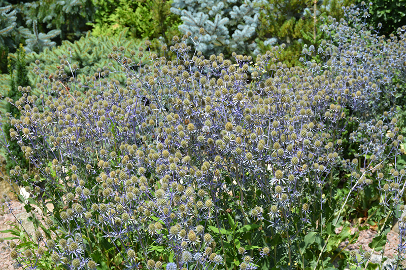 Blue Cap Sea Holly will grow to be about 24 inches tall at maturity extending to 3 feet tall with the flowers, with a spread of 18 inches. When grown in masses or used as a bedding plant, individual plants should be spaced approximately 15 inches apart. It tends to be leggy, with a typical clearance of 1 foot from the ground, and should be underplanted with lower-growing perennials. It grows at a fast rate, and under ideal conditions can be expected to live for approximately 10 years. As an herbaceous perennial, this plant will usually die back to the crown each winter, and will regrow from the base each spring. Be careful not to disturb the crown in late winter when it may not be readily seen!