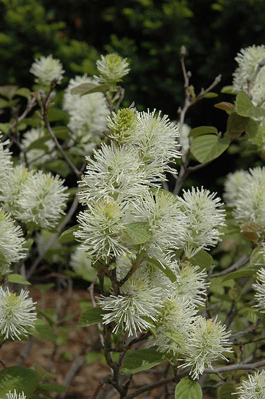 This notably hardy selection features showy white "bottle-brush" flowers in spring at the ends of bare branches, blue-green foliage has good orange-red fall color and a shapely rounded habit of growth; prefers light acidic soils