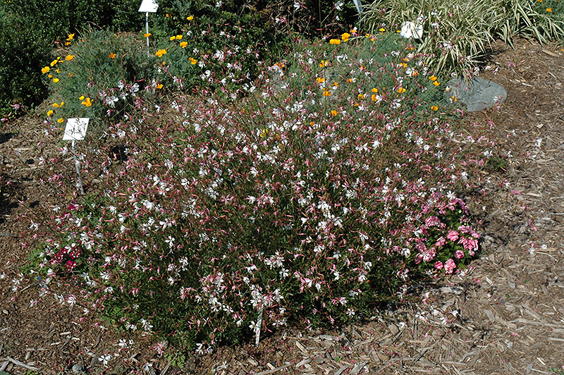 Snowstorm Gaura will grow to be about 16 inches tall at maturity extending to 24 inches tall with the flowers, with a spread of 24 inches. When grown in masses or used as a bedding plant, individual plants should be spaced approximately 18 inches apart. Its foliage tends to remain dense right to the ground, not requiring facer plants in front. Although it's not a true annual, this fast-growing plant can be expected to behave as an annual in our climate if left outdoors over the winter, usually needing replacement the following year. As such, gardeners should take into consideration that it will perform differently than it would in its native habitat.
