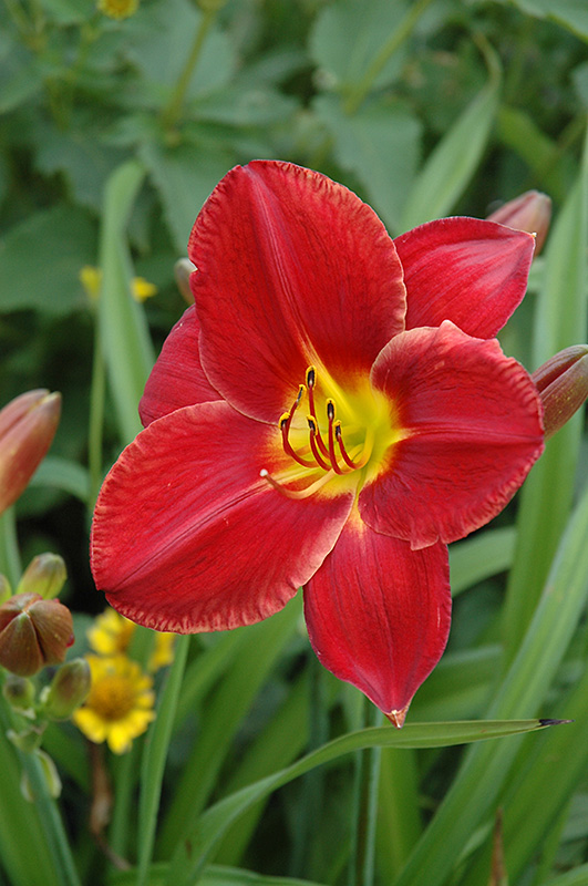 Large, velvety red trumpets with yellow-green throat; sturdy, strong, easy to care for, great grassy texture and form; good for the beginner gardener and the pro