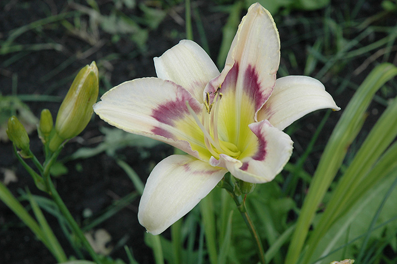 Mokan Butterfly Daylily features bold creamy white trumpet-shaped flowers with yellow throats and a purple ring at the ends of the stems in early summer. The flowers are excellent for cutting. Its grassy leaves remain green in colour throughout the season.