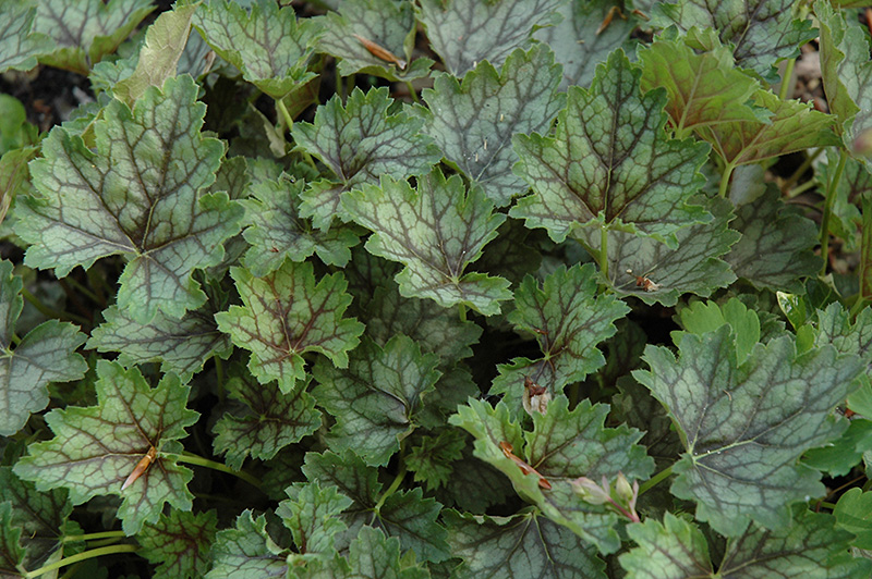 Dainty spikes of white bells rise from a compact mound of silver foliage, contrasting with darker gray-green to purple-gray veins, red tinged in fall; amazing contrast to other plants; great versatility; keep soil moist in heat of summer