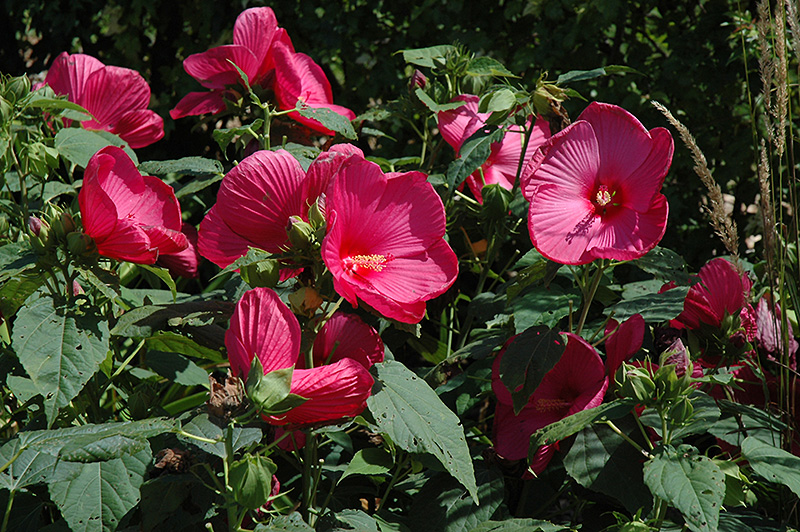 Pink Clouds Hibiscus features bold pink round flowers with red eyes at the ends of the stems from mid summer to early fall. Its large glossy oval leaves remain green in colour throughout the season.