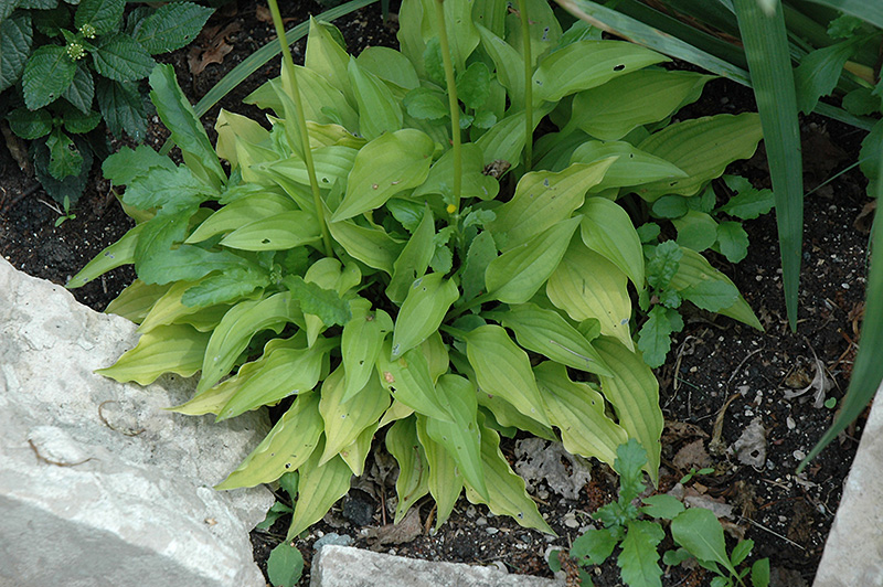 Ground Sulphur Hosta will grow to be about 12 inches tall at maturity extending to 28 inches tall with the flowers, with a spread of 12 inches. When grown in masses or used as a bedding plant, individual plants should be spaced approximately 10 inches apart. Its foliage tends to remain dense right to the ground, not requiring facer plants in front. It grows at a medium rate, and under ideal conditions can be expected to live for approximately 10 years. As an herbaceous perennial, this plant will usually die back to the crown each winter, and will regrow from the base each spring. Be careful not to disturb the crown in late winter when it may not be readily seen!