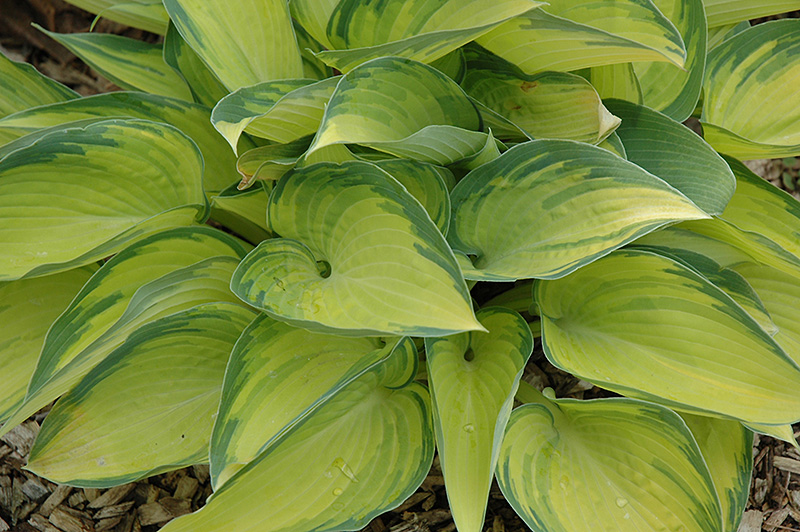 June Late Hosta will grow to be about 12 inches tall at maturity extending to 28 inches tall with the flowers, with a spread of 3 feet. When grown in masses or used as a bedding plant, individual plants should be spaced approximately 30 inches apart. Its foliage tends to remain dense right to the ground, not requiring facer plants in front. It grows at a medium rate, and under ideal conditions can be expected to live for approximately 10 years. As an herbaceous perennial, this plant will usually die back to the crown each winter, and will regrow from the base each spring. Be careful not to disturb the crown in late winter when it may not be readily seen!