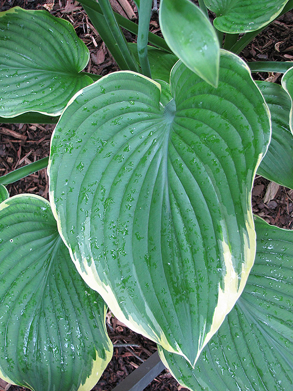 Shiny, wavy, dark-green leaves variegated with a creamy margin; provides beautiful texture and contrast to other plants; pale lavender spikes of flowers in mid-summer