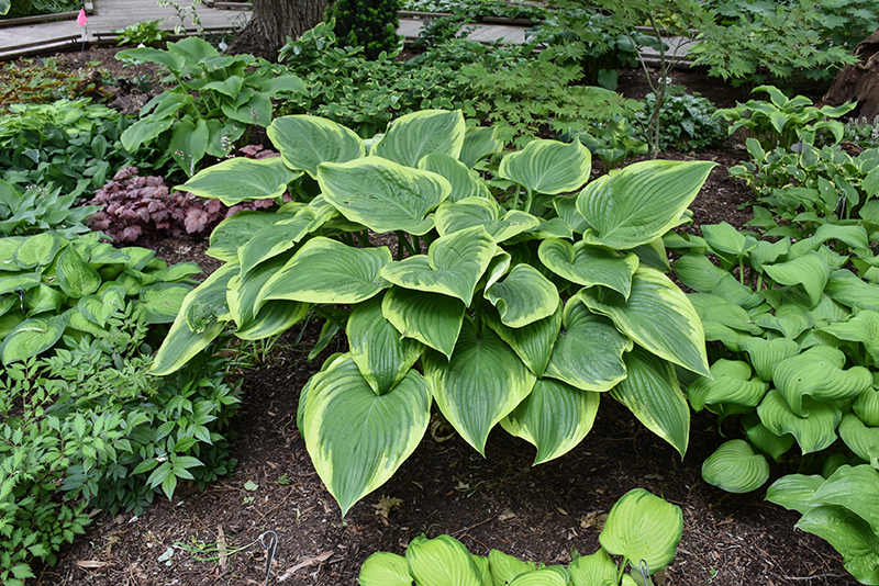 Leading Lady Hosta will grow to be about 15 inches tall at maturity extending to 28 inches tall with the flowers, with a spread of 3 feet. When grown in masses or used as a bedding plant, individual plants should be spaced approximately 30 inches apart. Its foliage tends to remain dense right to the ground, not requiring facer plants in front. It grows at a medium rate, and under ideal conditions can be expected to live for approximately 10 years. As an herbaceous perennial, this plant will usually die back to the crown each winter, and will regrow from the base each spring. Be careful not to disturb the crown in late winter when it may not be readily seen!