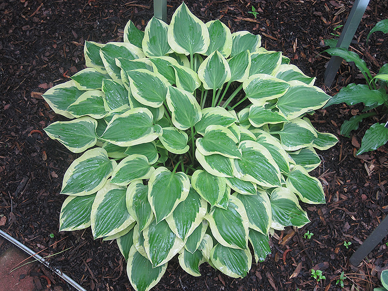 An adorable miniature hosta with medium green centers and cream variegation; provides beautiful texture and contrast to other plants; lavender spikes of flowers in mid-summer