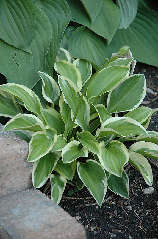 Cute miniature hosta has green leaves with cream variegation; provides beautiful texture and contrast to other plants; lavender spikes of flowers in mid-summer