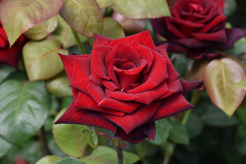 Alluring and mysterious describe well the dark deep red double blooms of this lovely hybrid; superior dark green foliage is large and adbundant creating a luxurious backdrop for these incredible blooms; this cultivar is vigorous and disease resistant