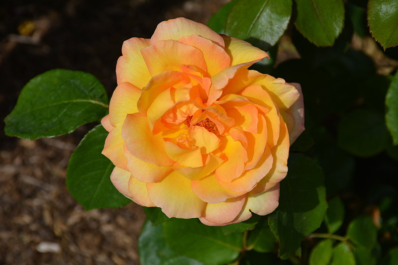 Beautiful eye-catching golden yellow blooms are framed with lovely hues of pink edging on the outer petals; a dramatic contrast with dark green glossy foliage on a solid upright bushy shrub; excellent for cut flowers, good disease resistance