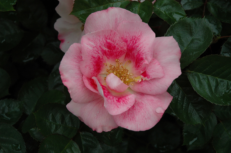 Funny Face Rose features showy fragrant semi-double shell pink flowers with hot pink streaks at the ends of the branches from late spring to early fall. The flowers are excellent for cutting. It has dark green deciduous foliage. The glossy oval compound leaves do not develop any appreciable fall colour. The fruits are showy red hips displayed in late fall.