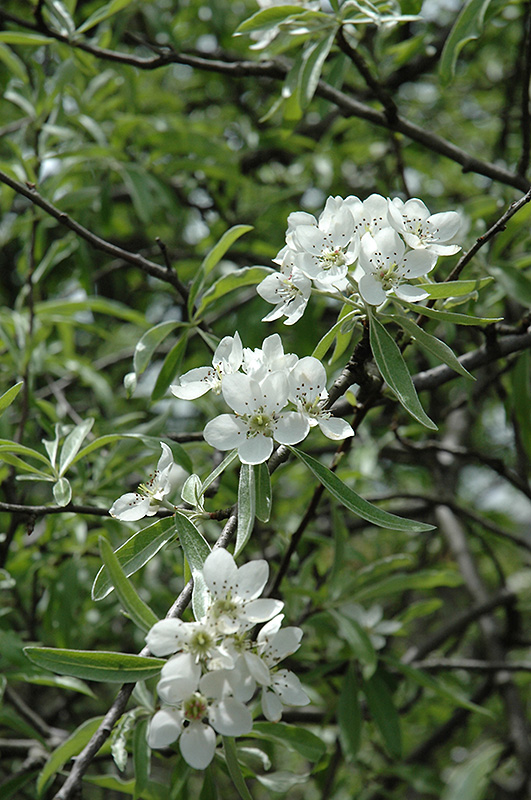 Silver Frost Weeping Willowleaf Pear is blanketed in stunning clusters of creamy white flowers with purple anthers along the branches in mid spring, which emerge from distinctive pink flower buds. It has attractive gray deciduous foliage which emerges silver in spring. The fuzzy narrow leaves are highly ornamental but do not develop any appreciable fall colour. The fruits are showy green pomes displayed in mid fall. The fruit can be messy if allowed to drop on the lawn or walkways, and may require occasional clean-up.