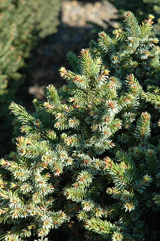 Pimoko Spruce is a dwarf conifer which is primarily valued in the landscape or garden for its decidedly oval form. It has attractive dark green foliage with silver undersides which emerges light green in spring. The needles are highly ornamental and remain dark green throughout the winter. The smooth brick red bark adds an interesting dimension to the landscape.