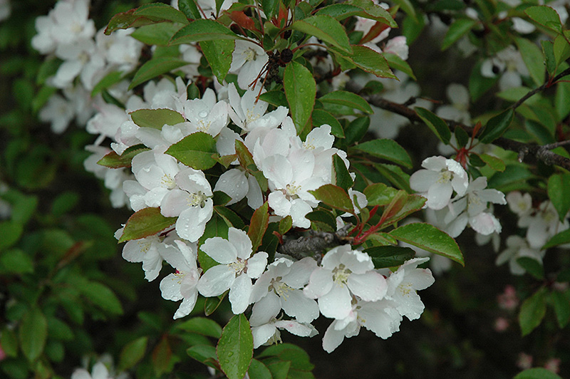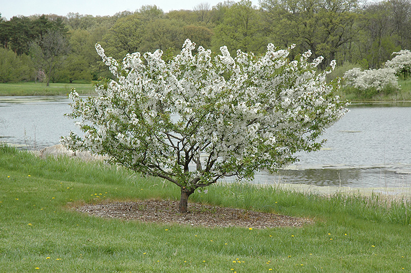 This stunning vase shaped ornamental tree is an excellent accent for the home landscape; smothered in highly fragrant shell pink flowers in mid to late spring followed by striking red fruit; fast growing and moderately disease resistant