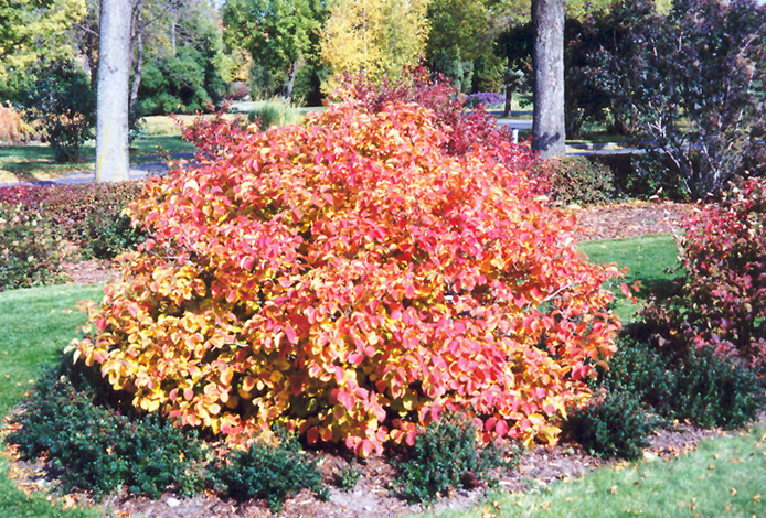A large trouble-free landscape shrub; features showy white "bottle-brush" flowers in spring at the ends of the bare branches, spectacular fall colors and a dense, rounded habit of growth, prefers light acidic soils; a truly all-purpose landscape plant