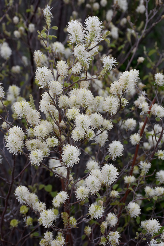 Large Fothergilla features showy spikes of fragrant white flowers rising above the foliage in mid spring before the leaves. It has dark green deciduous foliage. The round leaves turn an outstanding scarlet in the fall.