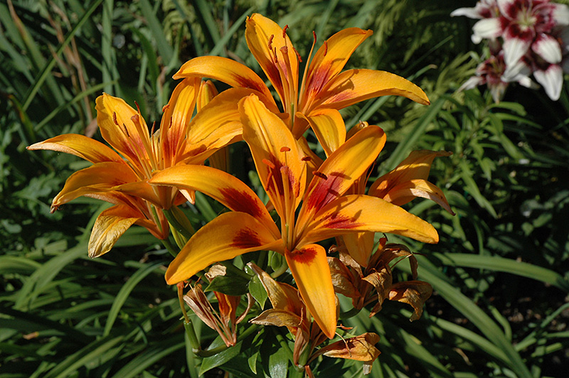 A stunning variety of Asiatic lily bearing large clusters of medium size flowers of excellent form and unusual color; the buds and blooms are a brilliant orange, unspotted, and featuring earthy-red brush marks; striking as an accent