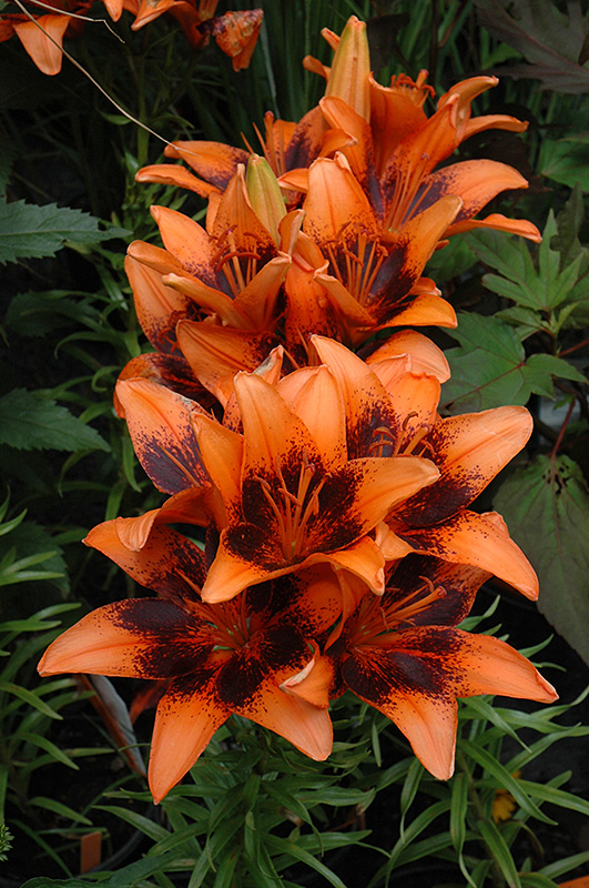 Orange Art Lily will grow to be about 3 feet tall at maturity extending to 4 feet tall with the flowers, with a spread of 18 inches. When grown in masses or used as a bedding plant, individual plants should be spaced approximately 14 inches apart. It tends to be leggy, with a typical clearance of 1 foot from the ground, and should be underplanted with lower-growing perennials. The flower stalks can be weak and so it may require staking in exposed sites or excessively rich soils. It grows at a fast rate, and under ideal conditions can be expected to live for approximately 10 years. As an herbaceous perennial, this plant will usually die back to the crown each winter, and will regrow from the base each spring. Be careful not to disturb the crown in late winter when it may not be readily seen!