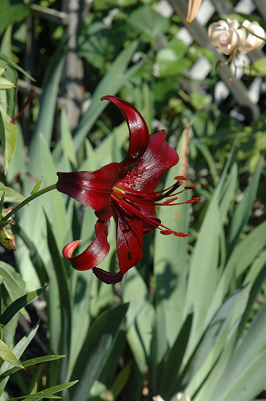 Night Flyer Lily features bold lightly-scented nodding burgundy trumpet-shaped flowers with black throats at the ends of the stems in mid summer. The flowers are excellent for cutting. Its narrow leaves remain green in colour throughout the season.
