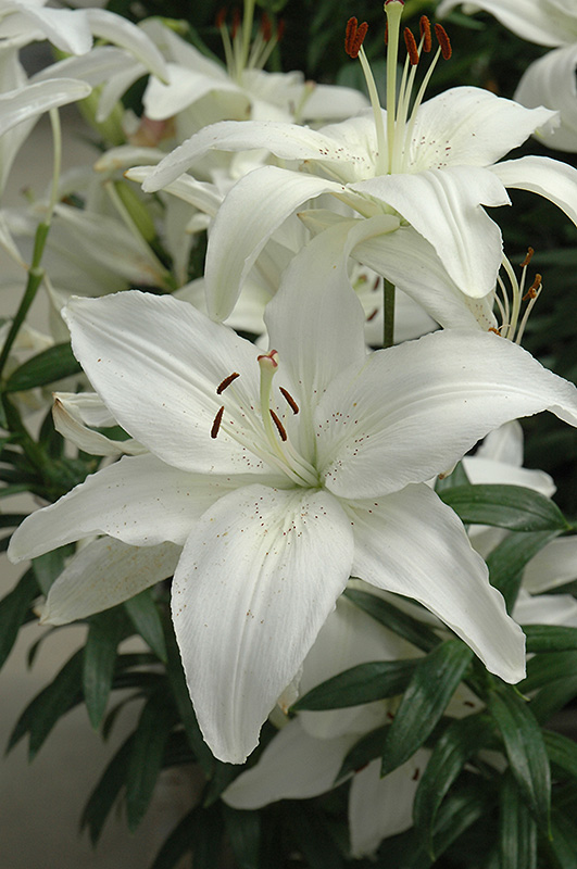 New Wave Lily features bold lightly-scented white trumpet-shaped flowers with black spots at the ends of the stems in mid summer. The flowers are excellent for cutting. Its narrow leaves remain green in colour throughout the season.