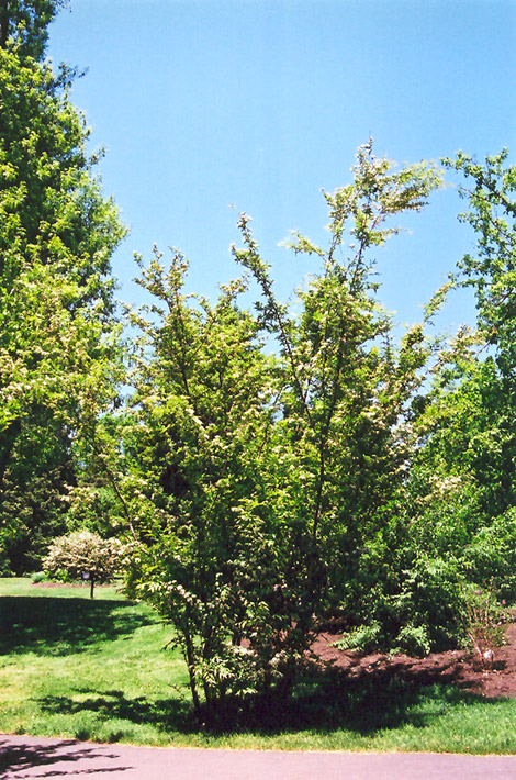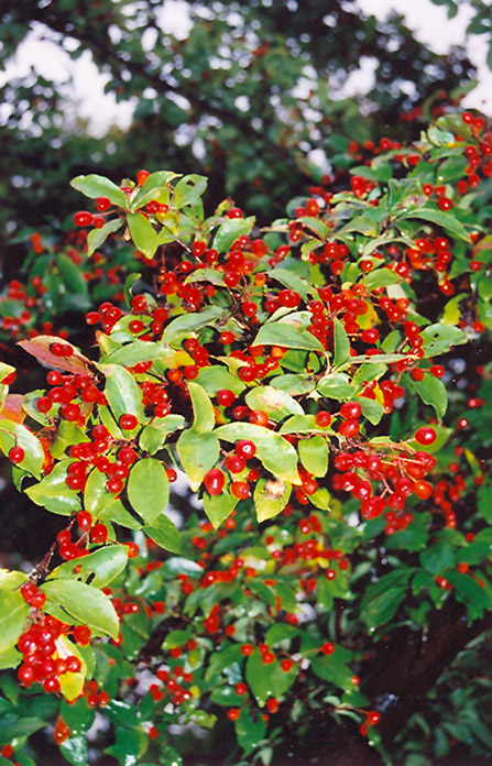 An attractive large shrub which features racemes of pretty white flowers in spring followed by showy red berries and good red fall color; can be susceptible to fireblight where this is a problem, monitor and manage as necessary