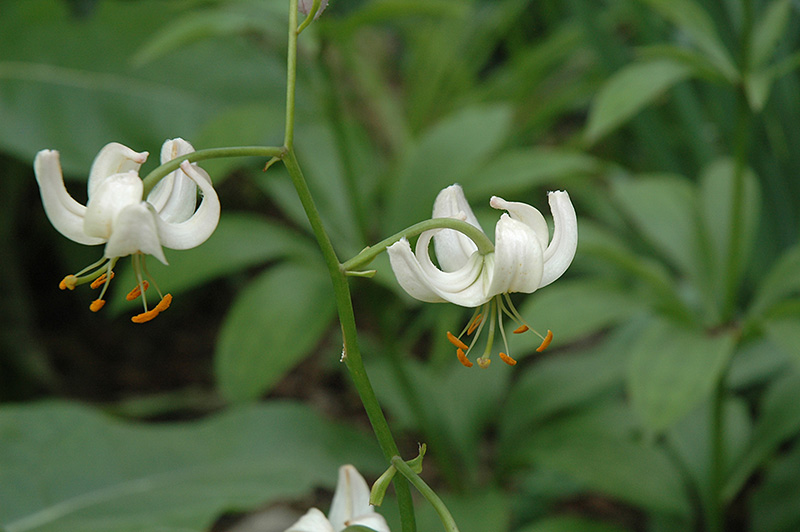Blush Martagon Lily features bold nodding white trumpet-shaped flowers at the ends of the stems in early summer. The flowers are excellent for cutting. Its narrow leaves remain green in colour throughout the season.