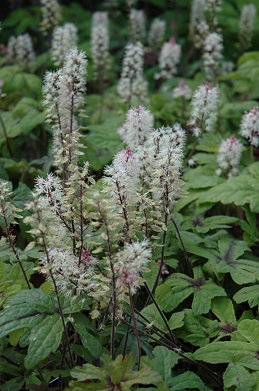 Spanish Cross Foamflower will grow to be only 6 inches tall at maturity extending to 12 inches tall with the flowers, with a spread of 15 inches. When grown in masses or used as a bedding plant, individual plants should be spaced approximately 12 inches apart. Its foliage tends to remain low and dense right to the ground. It grows at a medium rate, and under ideal conditions can be expected to live for approximately 10 years. As an evegreen perennial, this plant will typically keep its form and foliage year-round.
