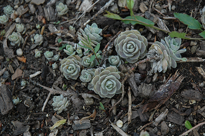 A very odd form of stonecrop with succulent dusty blue foliage that starts in rosettes, eventually mounding to form pyramidal columns upon which the delicate white flowers are borne; a must for the collector's rock garden