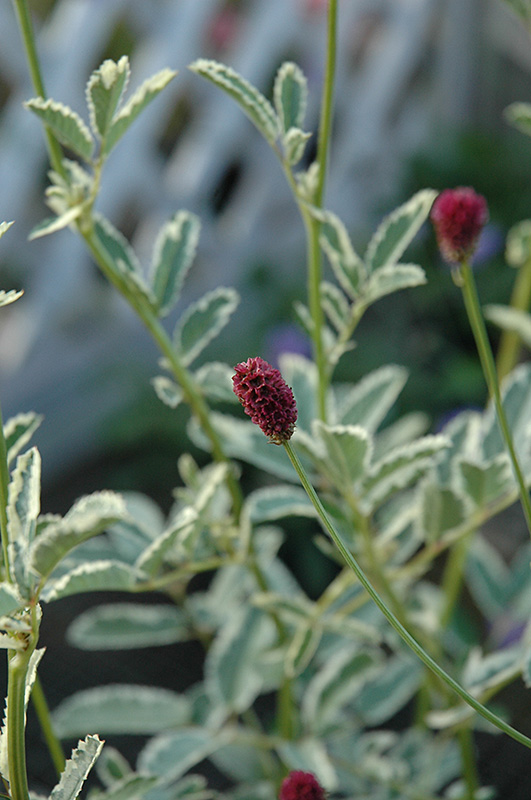 A hybrid of the burnet from the marble-rich area of Dali in southwest China, this tall, loose flowering bog plant produces magnificent bottle-brush like maroon flowers in summer over dazzling variegated blue-green toothed foliage; large yet open in habit
