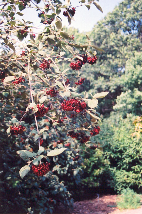 A large, open broadleaf evergreen shrub with showy flat-topped clusters of white flowers in spring and fruit which starts pinkish-red changing to black in fall, highly ornamental; somewhat coarse, grows quite large, makes a great tall privacy screen