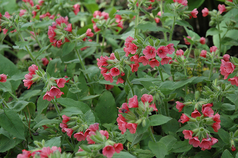Salmon Glow Lungwort will grow to be about 8 inches tall at maturity, with a spread of 24 inches. When grown in masses or used as a bedding plant, individual plants should be spaced approximately 20 inches apart. Its foliage tends to remain low and dense right to the ground. It grows at a medium rate, and under ideal conditions can be expected to live for approximately 10 years. As an herbaceous perennial, this plant will usually die back to the crown each winter, and will regrow from the base each spring. Be careful not to disturb the crown in late winter when it may not be readily seen!
