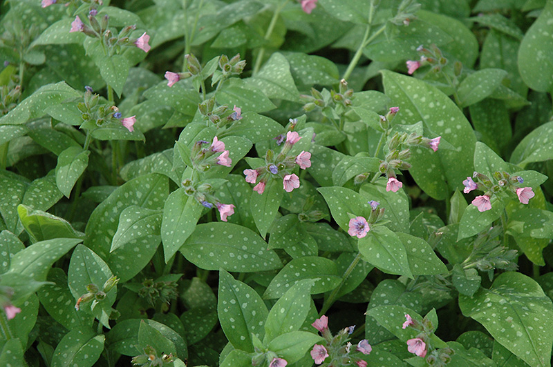 Bielefeld Pink Lungwort will grow to be about 12 inches tall at maturity, with a spread of 18 inches. When grown in masses or used as a bedding plant, individual plants should be spaced approximately 15 inches apart. Its foliage tends to remain dense right to the ground, not requiring facer plants in front. It grows at a medium rate, and under ideal conditions can be expected to live for approximately 10 years. As an herbaceous perennial, this plant will usually die back to the crown each winter, and will regrow from the base each spring. Be careful not to disturb the crown in late winter when it may not be readily seen!