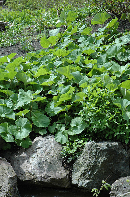 Japanese Butterbur will grow to be about 3 feet tall at maturity extending to 4 feet tall with the flowers, with a spread of 4 feet. When grown in masses or used as a bedding plant, individual plants should be spaced approximately 4 feet apart. It grows at a fast rate, and under ideal conditions can be expected to live for approximately 20 years. As an herbaceous perennial, this plant will usually die back to the crown each winter, and will regrow from the base each spring. Be careful not to disturb the crown in late winter when it may not be readily seen!