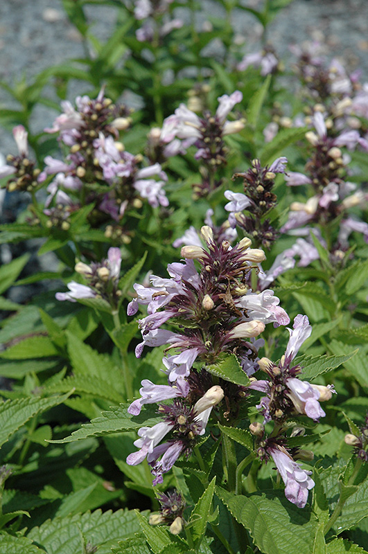 Large clusters of larger than normal pale lavender-pink flowers densely cover this catmint, hiding the glossy dark green foliage of these mounding plants
