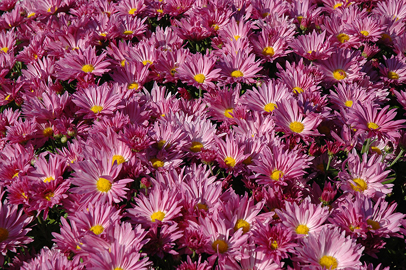 Pink Daisy Chrysanthemum is covered in stunning pink daisy flowers with yellow eyes at the ends of the stems from early to late fall. The flowers are excellent for cutting. Its fragrant ferny leaves remain dark green in colour throughout the season.