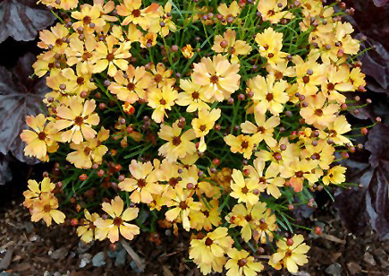 Compact plant with cheery, daisy-like yellow flowers with rosy undertones and a central gold disk; tolerant of pests and drier soils; thriving in sandy and rocky soils; coreopsis needs good drainage