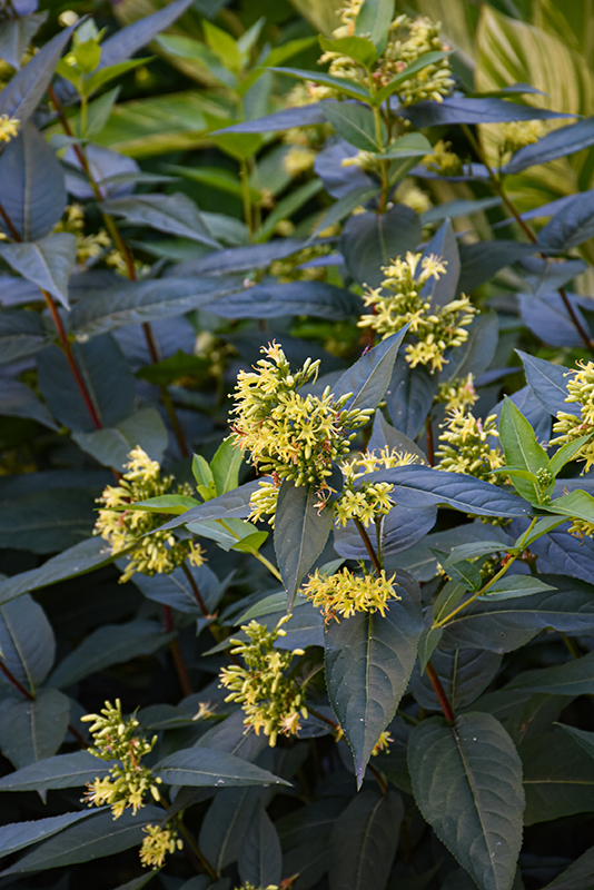 Butterfly Southern Bush Honeysuckle is primarily valued in the landscape or garden for its cascading habit of growth. It features subtle panicles of yellow trumpet-shaped flowers along the branches in early summer. It has attractive coppery-bronze-tipped dark green foliage which emerges coppery-bronze in spring. The glossy pointy leaves are highly ornamental but do not develop any appreciable fall colour.