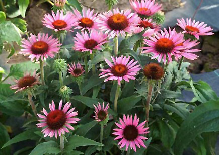 This dwarf, mounded selection has abundant rose-pink flowers with a flattened orange cone, sunflower-like in a appearance; fragrant and great for flower arrangements, attracts pollinators and feeds the birds at winter