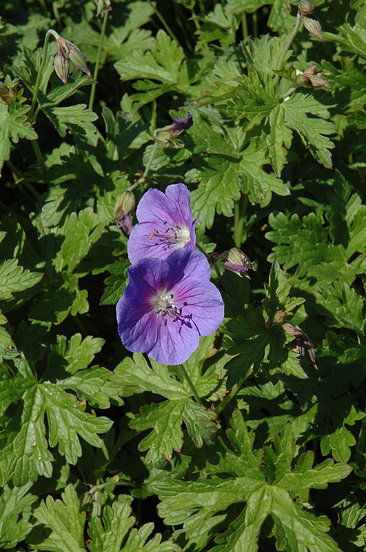 This mat forming geranium makes a great groundcover and rock garden plant; this beauty is bathed in violet-blue saucer shaped blooms with rosy glow around a white center; deadhead spent flowers for reblooming later in the season