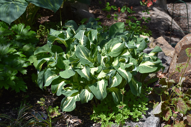 Regal Twist Hosta will grow to be about 12 inches tall at maturity extending to 18 inches tall with the flowers, with a spread of 18 inches. When grown in masses or used as a bedding plant, individual plants should be spaced approximately 15 inches apart. Its foliage tends to remain dense right to the ground, not requiring facer plants in front. It grows at a medium rate, and under ideal conditions can be expected to live for approximately 10 years. As an herbaceous perennial, this plant will usually die back to the crown each winter, and will regrow from the base each spring. Be careful not to disturb the crown in late winter when it may not be readily seen!