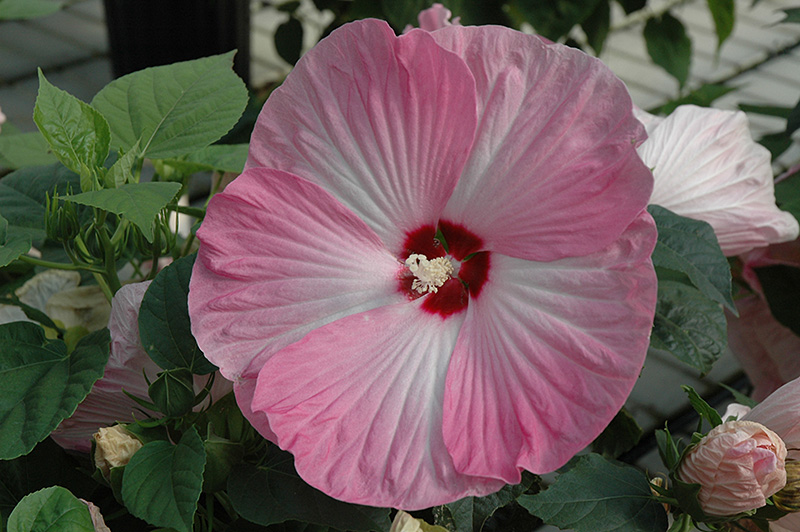 Showy, gigantic, ruffled pink flowers with a dark-red eye; the large flowers really make a bold statement on this plant that's under 3 feet tall; attractive, glossy, large, dark-green leaves; do not allow to dry to wilting point