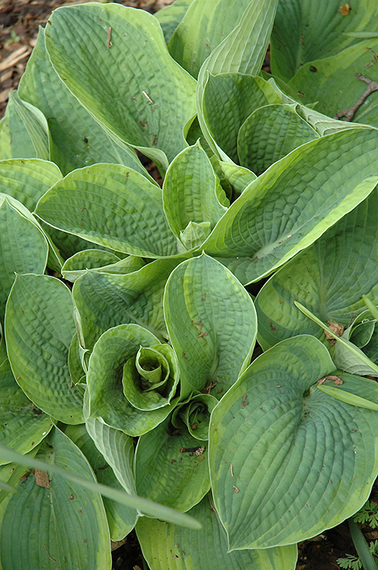 A lovely variety featuring textured, blue-green leaves with golden yellow margins and variegation; pale lavender flowers rise above on tall scapes during the mid-summer months; adds texture, contrast and color to shaded beds, borders and containers