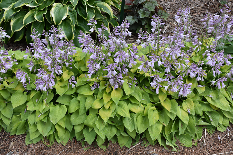 Gold Drop Hosta features dainty spikes of lilac purple tubular flowers rising above the foliage from mid summer to early fall. Its attractive small textured heart-shaped leaves remain chartreuse in colour throughout the season.